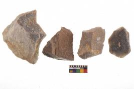 | Description / विवरण | There are n-4 of utilized flake cores. There are multidirectional irregular dominant scar pattern on both dorsal and ventral face of the cores. Some of them bulge of percussion and some are flat flake cores. |