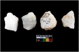 | Description / विवरण | A specimen of a fluted core having very few fluted marks before removing of blades form it. It is roughly rounded in shape and white in colour. |