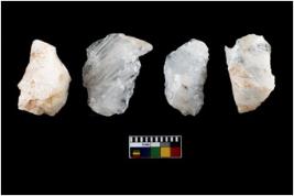 | Description / विवरण | A specimen of a fluted core having very few fluted marks before removing of blades form it. It is roughly rounded in shape and white in colour. |