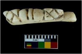 | Description / विवरण | A broken fragment of a decorated shell bangle. It is creamish in colour with rectangular cross section. |