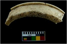 | Description / विवरण | A broken fragment of a decorated shell bangle. It is creamish in colour with rectangular cross section. |