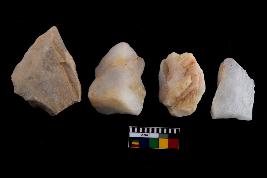 | Description / विवरण | There are n-4 of utilized flake cores. There are multidirectional irregular dominant scar pattern on both dorsal and ventral face of the cores. Some of them bulge of percussion and some are flat flake cores. |