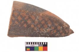 | Description / विवरण | Specimen of potsherd with decorative geometric Net Pattern painting, Type Black on Red Ware . |