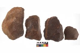 | Description / विवरण | There are n-4 of utilized flake cores. There are multidirectional irregular dominant scar pattern on both dorsal and ventral face of the cores. Some of them bulge of percussion and some are flat flake cores. |