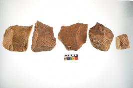 | Description / विवरण | There are n-5 of utilized flake cores. There are multidirectional irregular dominant scar pattern on both dorsal and ventral face of the cores. Some of them bulge of percussion and some are flat flake cores. |