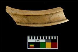 | Description / विवरण | A broken fragment of a decorated shell bangle. It is creamish in colour with rectangular cross section. |