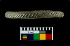 | Description / विवरण | A broken fragment of a decorated shell bangle. It is blackish in colour with rectangular cross section. |