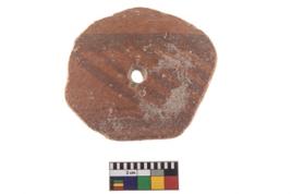 | Description / विवरण | A perforated disc of Black on Red Ware with slanting lines in a panel. |