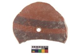 | Description / विवरण | A perforated disc of Black on Red Ware with two horizontal bands. |