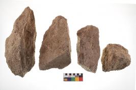 | Description / विवरण | There are n-4 of utilized flake cores. There are multidirectional irregular dominant scar pattern on both dorsal and ventral face of the cores. Some of them bulge of percussion and some are flat flake cores. |