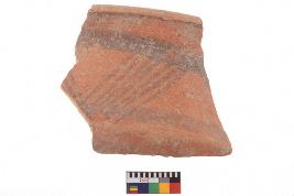 | Description / विवरण | Specimen of potsherd with decorative geometric Linear Pattern painting, Type Black on Red Ware . |