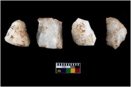 | Description / विवरण | A specimen of a fluted core having very few fluted marks before removing of blades form it. It is roughly rounded in shape and white in colour. |