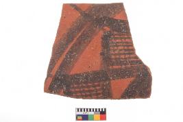| Description / विवरण | Specimen of potsherd with decorative geometric Diamond set broad horizontal bands painting, Type Black on Red Ware . |