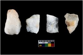 | Description / विवरण | A specimen of a fluted core having very few fluted marks before removing of blades form it. It is roughly rounded in shape and white in colour. |