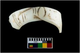 | Description / विवरण | A broken fragment of a decorated shell bangle. It is creamish in colour with rectangular cross section. |