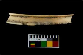 | Description / विवरण | A broken fragment of a decorated shell bangle. It is creamish in colour with rectangular cross section. |