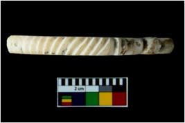 | Description / विवरण | A broken fragment of a decorated shell bangle. It is creamish in colour with rectangular cross section. |