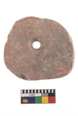 | Description / विवरण | Terracotta perforated disc with circular shape and irregular edges round perforation in the middle, reddish in colour. |