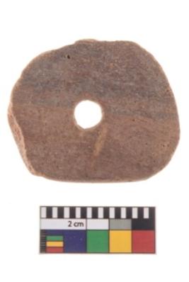 | Description / विवरण | A perforated disc of Black on Red Ware with a horizontal band. |