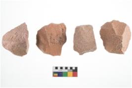 | Description / विवरण | Specimen of flake tools with prominent flaking marks. It made up of a short flakes with sides trimmed. |