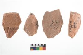 | Description / विवरण | Specimen of flake tools with prominent flaking marks. It made up of a short flakes with sides trimmed. |