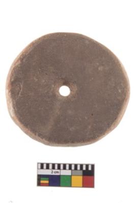 | Description / विवरण | Terracotta perforated disc with circular shape and irregular edges round perforation in the middle, |