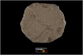 | Description / विवरण | A complete spacimen of a disc made of a stone, it is round and flat in shape with flaked edge , Battered surface, |