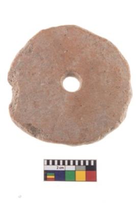 | Description / विवरण | Terracotta perforated disc with circular shape and irregular edges round perforation in the middle, reddish in colour. |