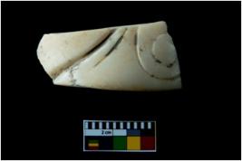 | Description / विवरण | A broken fragment of a decorated shell bangle. It is creamish in colour with rectangular cross section. |