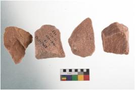 | Description / विवरण | Specimen of flake tools with prominent flaking marks. It made up of a short flakes with sides trimmed. |
