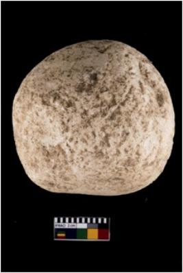 | Description / विवरण | A complete specimen of a hammerstone made of quartz, It is roughly circular in shape with flat base, It has rough surface with slightly battered surface |