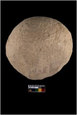 | Description / विवरण | A partially broken specimen of hammerstone made of quartz , It is irregularly circular in shape with rough and slightly battered surface |