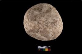 | Description / विवरण | A complete specimen of hammerstone made of quartz , It is irregularly circular in shape , it has rough battered surface. |