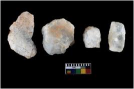 | Description / विवरण | A specimen of a fluted core having few fluted marks before removing of blades form it. It is roughly rounded in shape and white in colour. |
