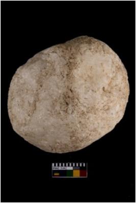 | Description / विवरण | A partially broken specimen of hammerstone made of quartz, It is round in shape, It has rough battered surface |