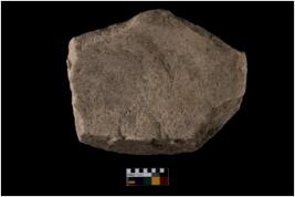 | Description / विवरण | A partially broken specimen of a saddle quern made of quartzite, upper surface shows oval shaped depression due to use. |