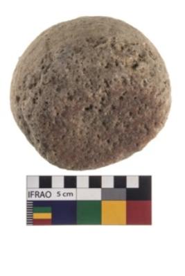 | Description / विवरण | A partially broken specimen of a hammerstone made of quartz, It is irregularly circular in shape with rough surface. |