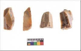 | Description / विवरण | Four utilised worked cores with sharp edges. Flakes removed from almost all the sides. Some are tapering at one end. |