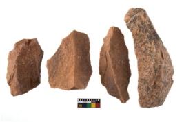 | Description / विवरण | Specimen of flake tool with prominent flaking marks. They are made up of a short flakes with sides trimmed. |