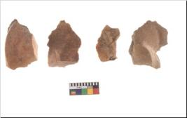 | Description / विवरण | Four utilised worked cores with sharp edges. Flakes removed from almost all the sides. Some are tapering at one end. |