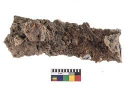 | Description / विवरण | A partially broken specimen of a iron clamp with rectngular shape it has nail at present It is highly corroded. |