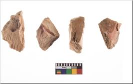 | Description / विवरण | Four utilised worked cores with sharp edges. Flakes removed from almost all the sides. Some are tapering at one end. |