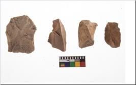 | Description / विवरण | Four utilised worked cores with sharp edges. Flakes removed from almost all the sides. Some are tapering at one end. |