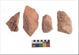 | Description / विवरण | Specimen of flake tools with prominent flaking marks. It made up of a short flakes with sides trimmed. |