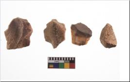| Description / विवरण | Four utilised worked cores with sharp edges. Flakes removed from almost all the sides. Some are tapering at one end. |