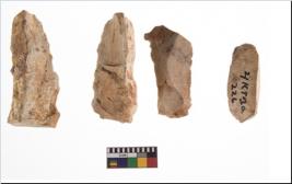 | Description / विवरण | Four utilised worked cores with sharp edges. Flakes removed from almost all the sides. Some are tapering at one end. |