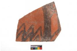 | Description / विवरण | Specimen of potsherd with decorative geometric Set of two zigzag bands painting, Type Black on Red Ware . |