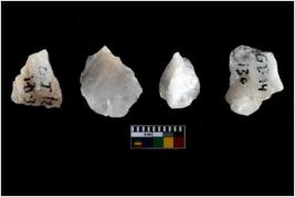 | Description / विवरण | Four utilised worked cores with sharp edges. Flakes removed from almost all the sides. Some are tapering at one end. |