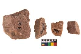 | Description / विवरण | Specimen of flake tool with prominent flaking marks. They are made up of a short flakes with sides trimmed. |