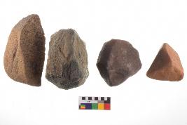 | Description / विवरण | There are n-4 of utilized flake cores. There are multidirectional irregular dominant scar pattern on both dorsal and ventral face of the cores. Some of them bulge of percussion and some are flat flake cores. |